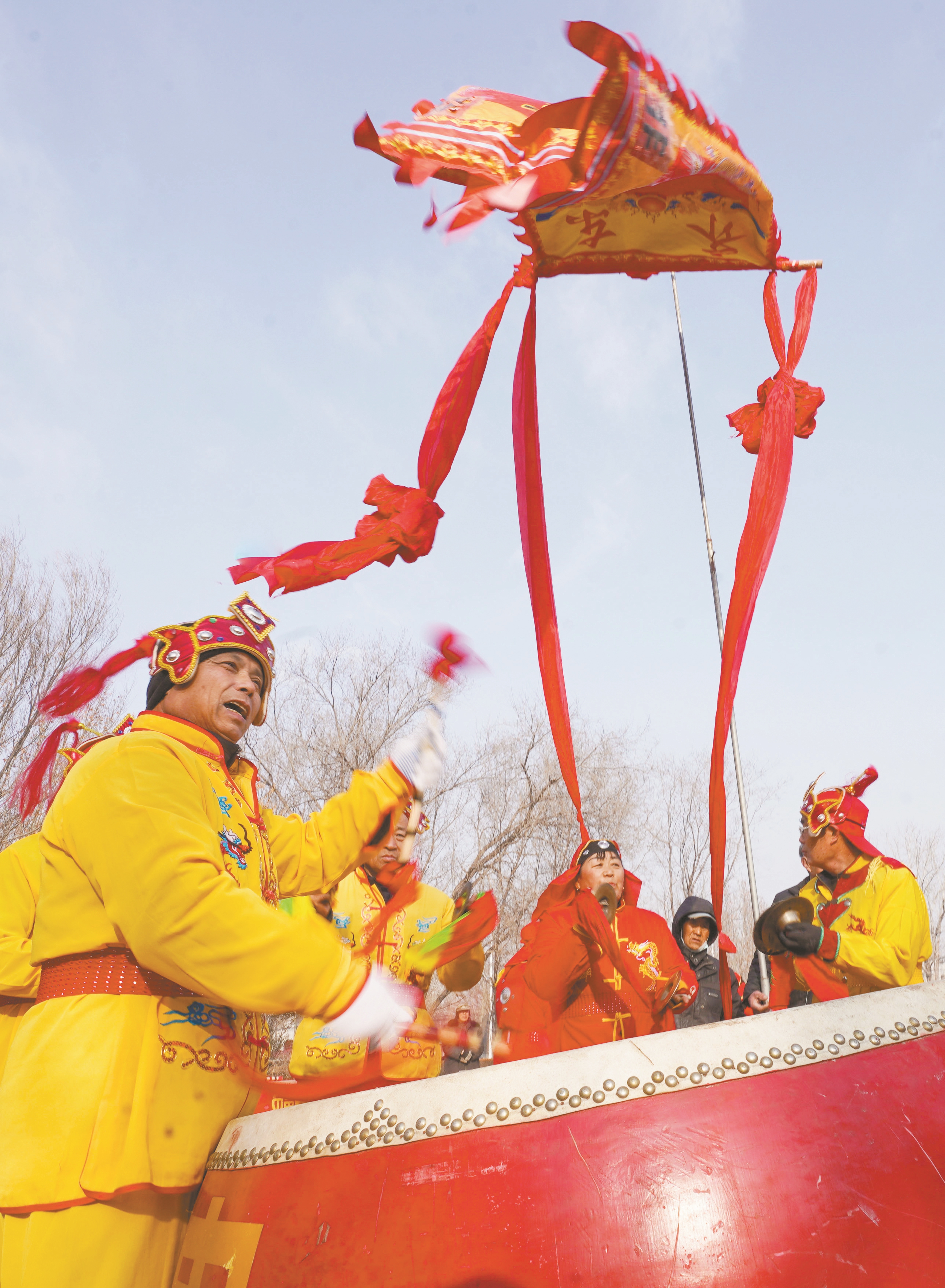 佳节将至,年味渐浓,各地张灯结彩,举办喜庆活动。人们购年货、逛集市、游玩赏景,喜迎新春。 图为2月5日,在山东省邹平市台子镇,黄河大鼓表演队在文艺广场为村民表演。(新华社发)