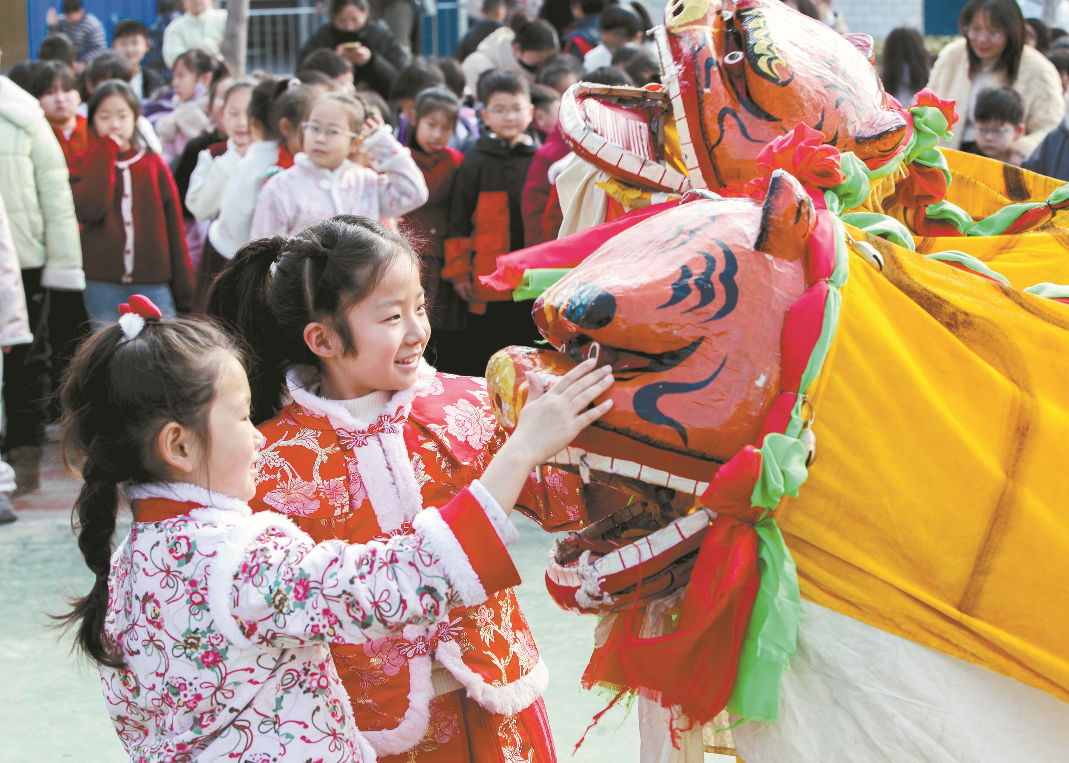 图为2月5日,在河南省焦作市博爱县清化镇街道七街小学,学生们与进行老虎舞表演的“老虎”互动。(新华社发)