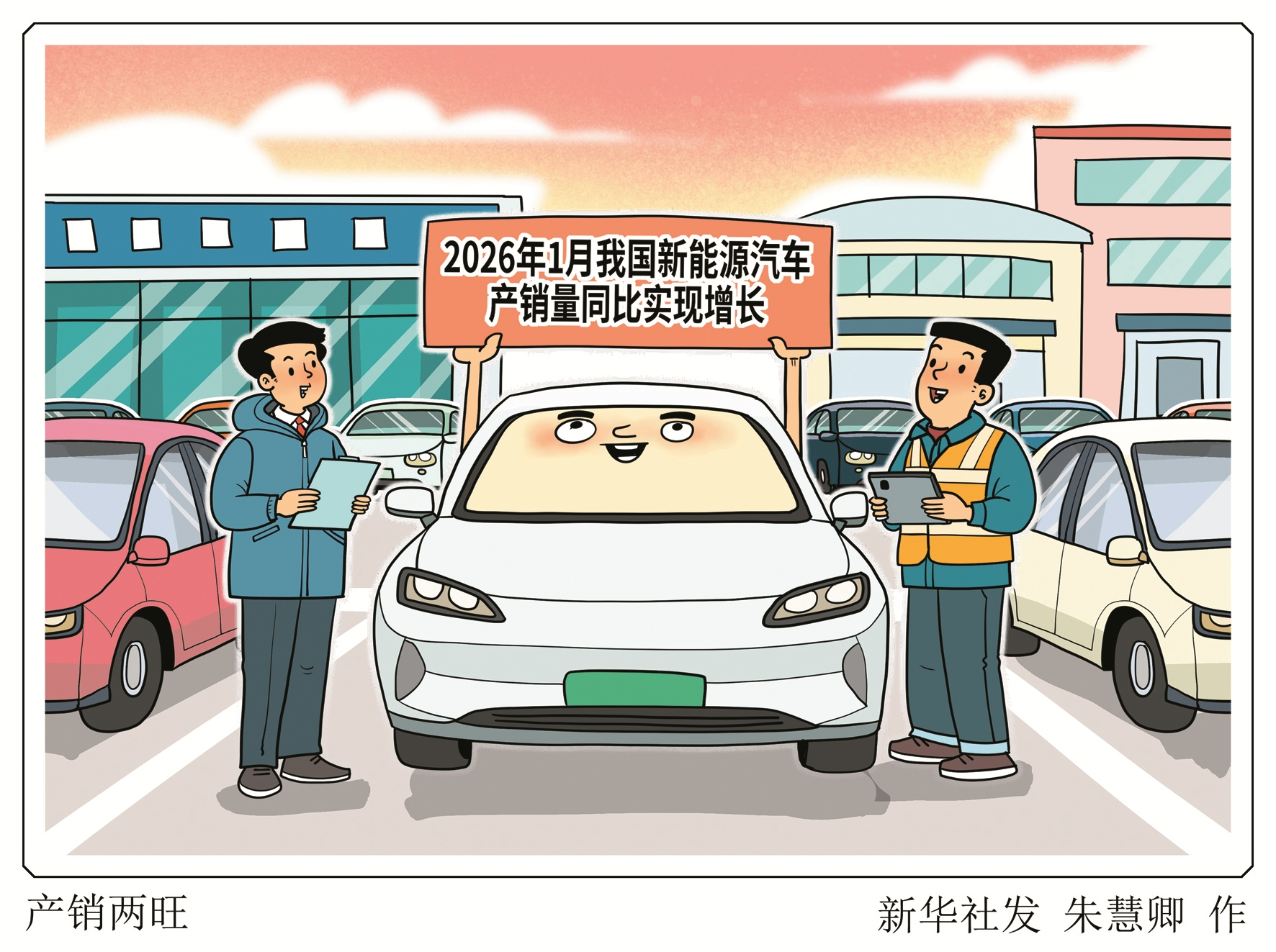 中国汽车工业协会2月11日发布数据显示,2026年1月份,我国新能源汽车产销分别完成104.1万辆和94.5万辆,同比分别增长2.5%和0.1%。 (新华社发)