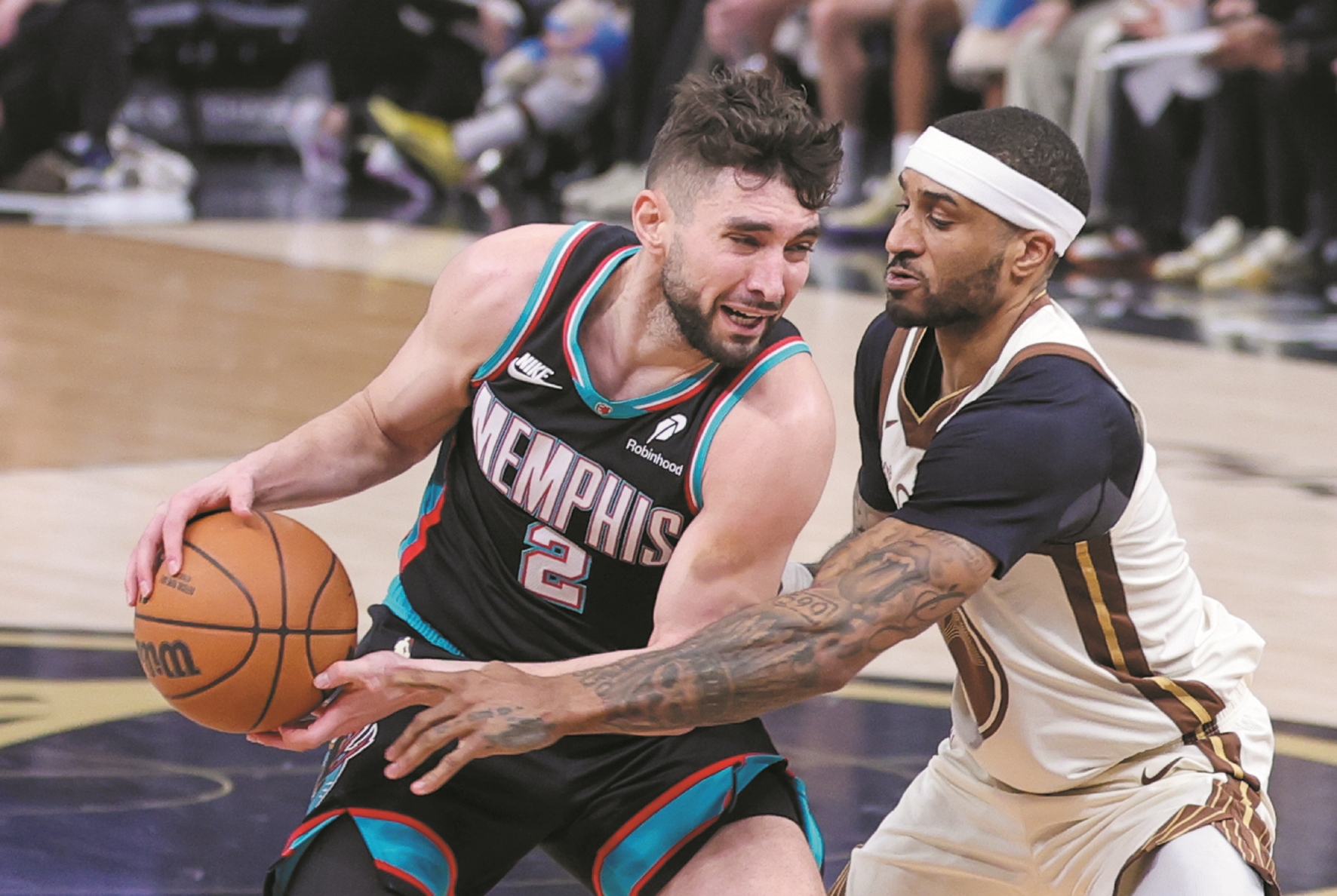 图为2月9日,勇士队球员佩顿二世(右)在比赛中防守。