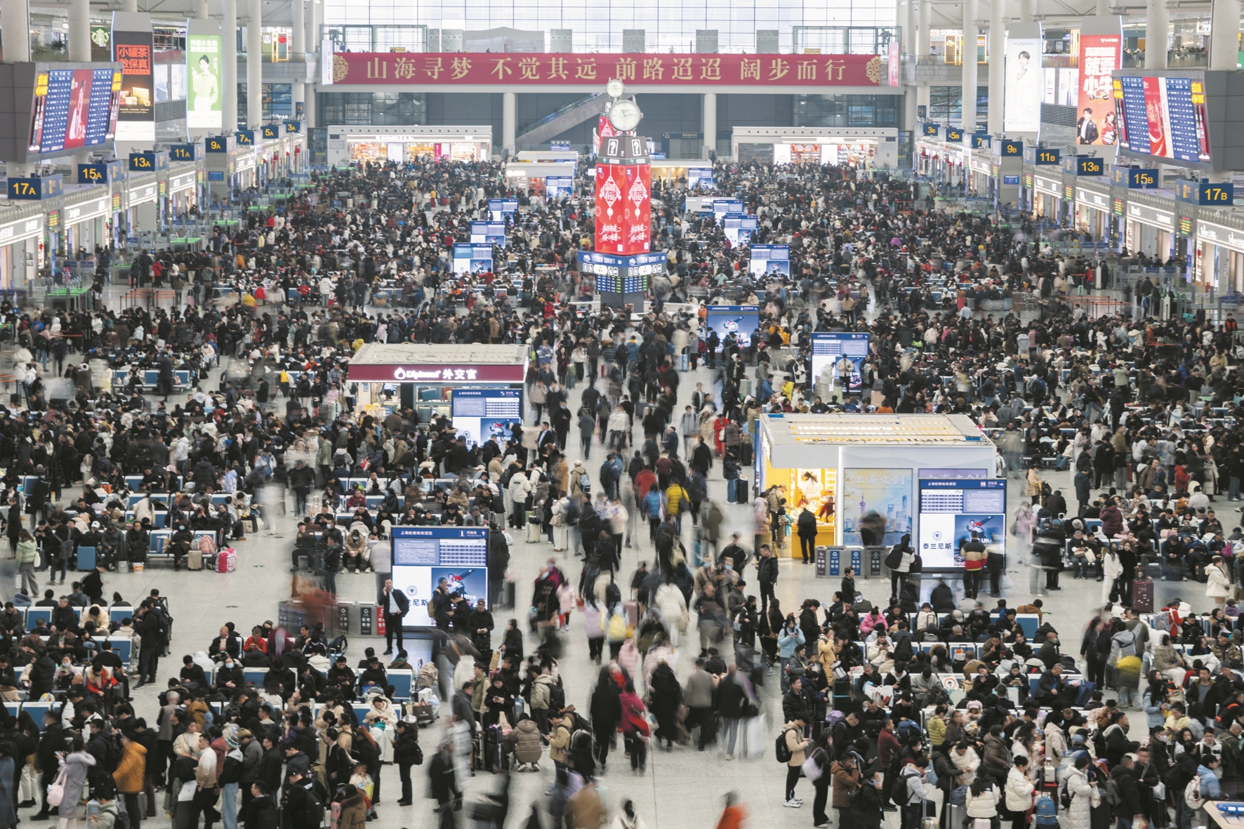图②为2月2日拍摄的上海虹桥火车站候车大厅。 (新华社发)