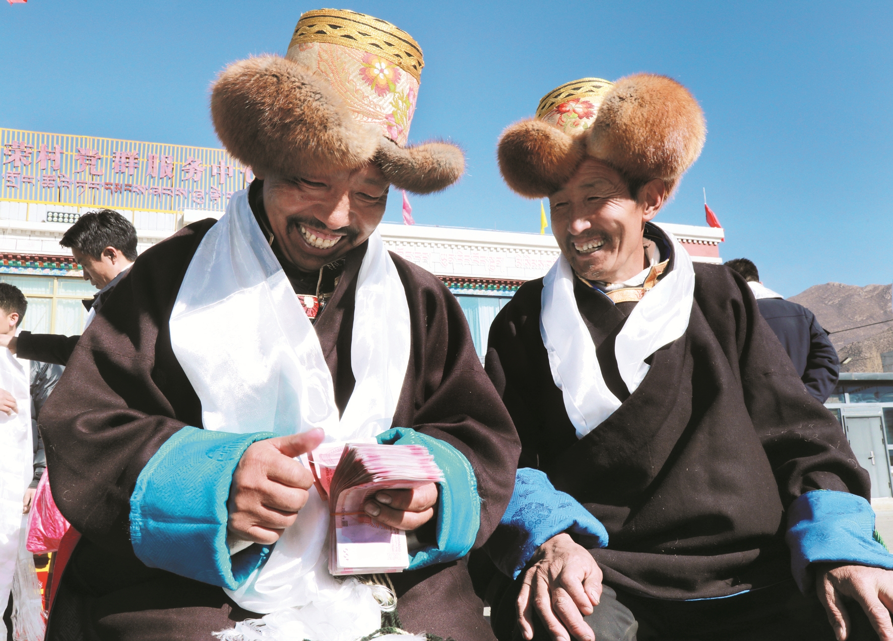 图为分红现场,村民领到“新年红包”乐开怀。 拉萨融媒记者 莫瑞英摄