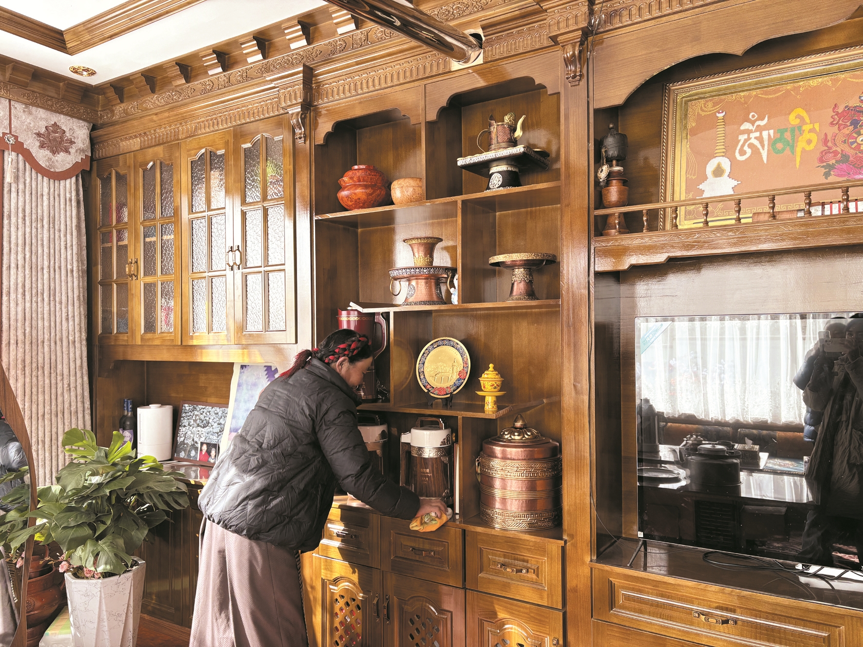 冬日的阳光洒进村民强达家的客厅,强达的老伴儿正拿着抹布仔细擦拭着崭新的藏式木柜,柜面上的花纹在擦拭后愈发鲜亮.强达家新建的房屋为两层小楼,屋内宽敞明亮,中式风格的装修简约又温馨。