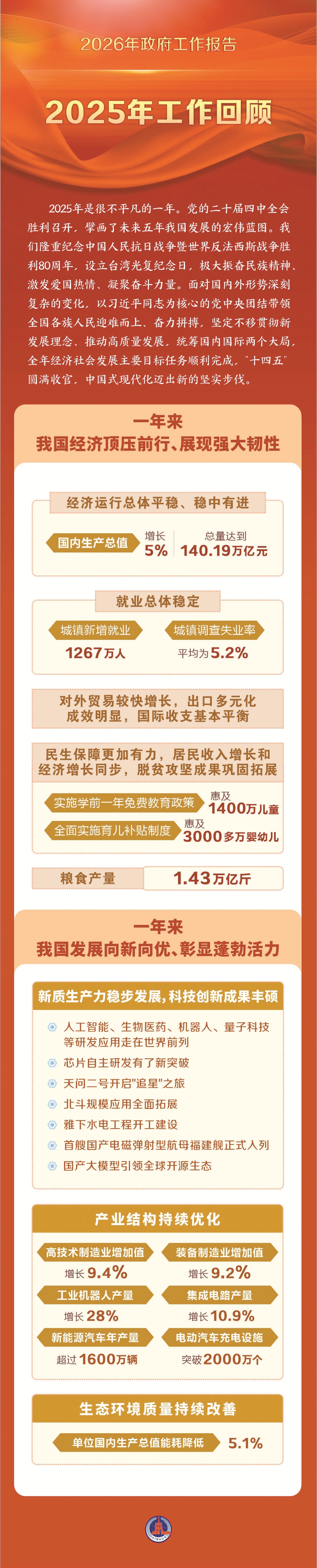 一年来,我国发展向新向优、彰显蓬勃活力。新质生产力稳步发展,科技创新成果丰硕,人工智能、生物医药、机器人、量子科技等研发应用走在世界前列,芯片自主研发有了新突破,天问二号开启“追星”之旅,北斗规模应用全面拓展,雅下水电工程开工建设,首艘国产电磁弹射型航母福建舰正式入列,国产大模型引领全球开源生态。产业结构持续优化,高技术制造业、装备制造业增加值分别增长9.4%、9.2%,工业机器人、集成电路产量分别增长28%、10.9%,新能源汽车年产量超过1600万辆,电动汽车充电设施突破2000万个。单位国内生产总值能耗降低5.1%,生态环境质量持续改善。