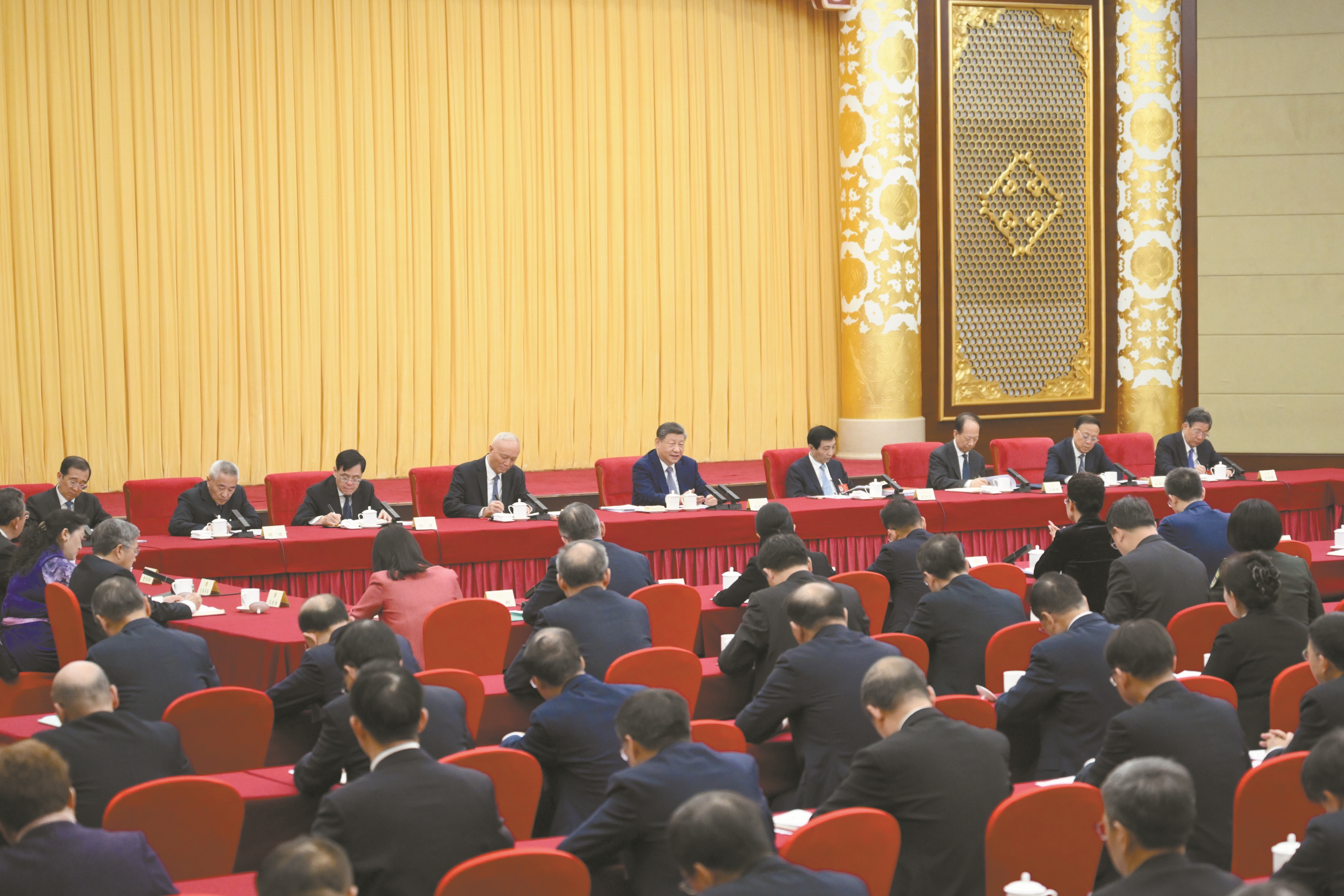 中共中央政治局常委、全国政协主席王沪宁,中共中央政治局常委、中央办公厅主任蔡奇参加看望和讨论。