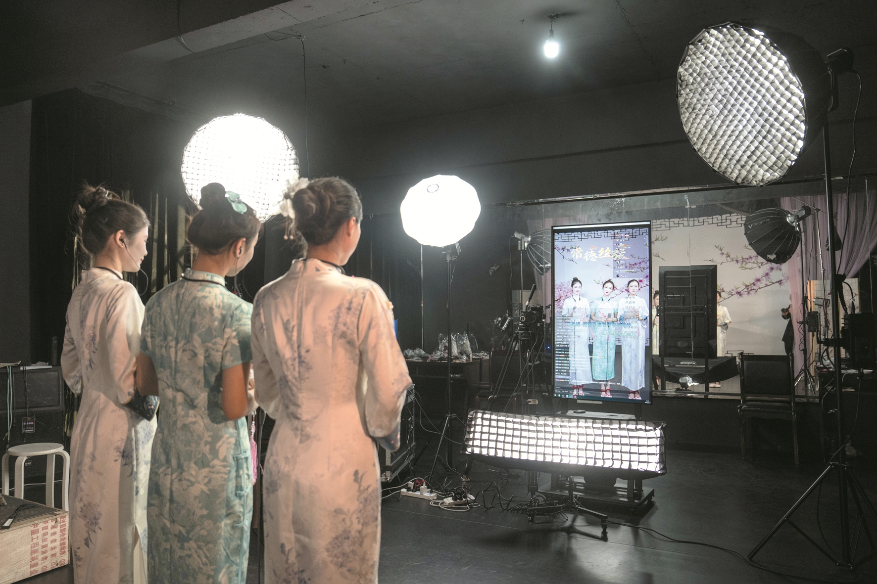 图为2025年3月17日,湖南省常德丝弦艺术剧院青年演员在进行常德丝弦的推广直播。 新华社记者 陈思汗摄