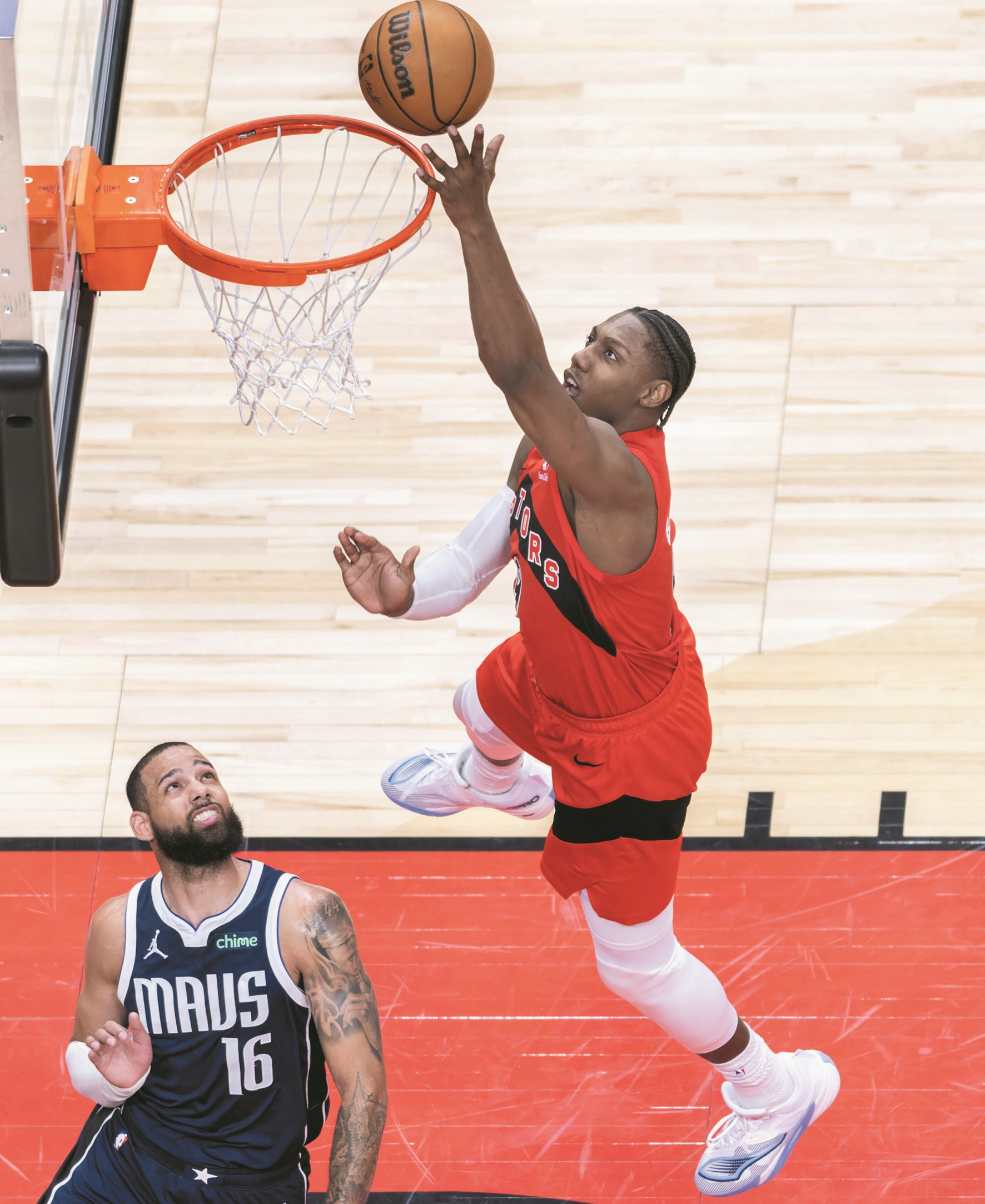 图为3月8日,猛龙队球员巴雷特(右)在比赛中上篮。
