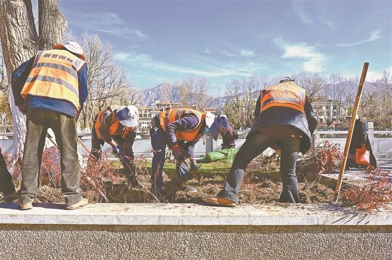 阳春三月,雪域高原春意渐浓。在拉萨市区的一处公园绿地内,园林工人们正抢抓春季绿化黄金期,开展苗木栽植作业。