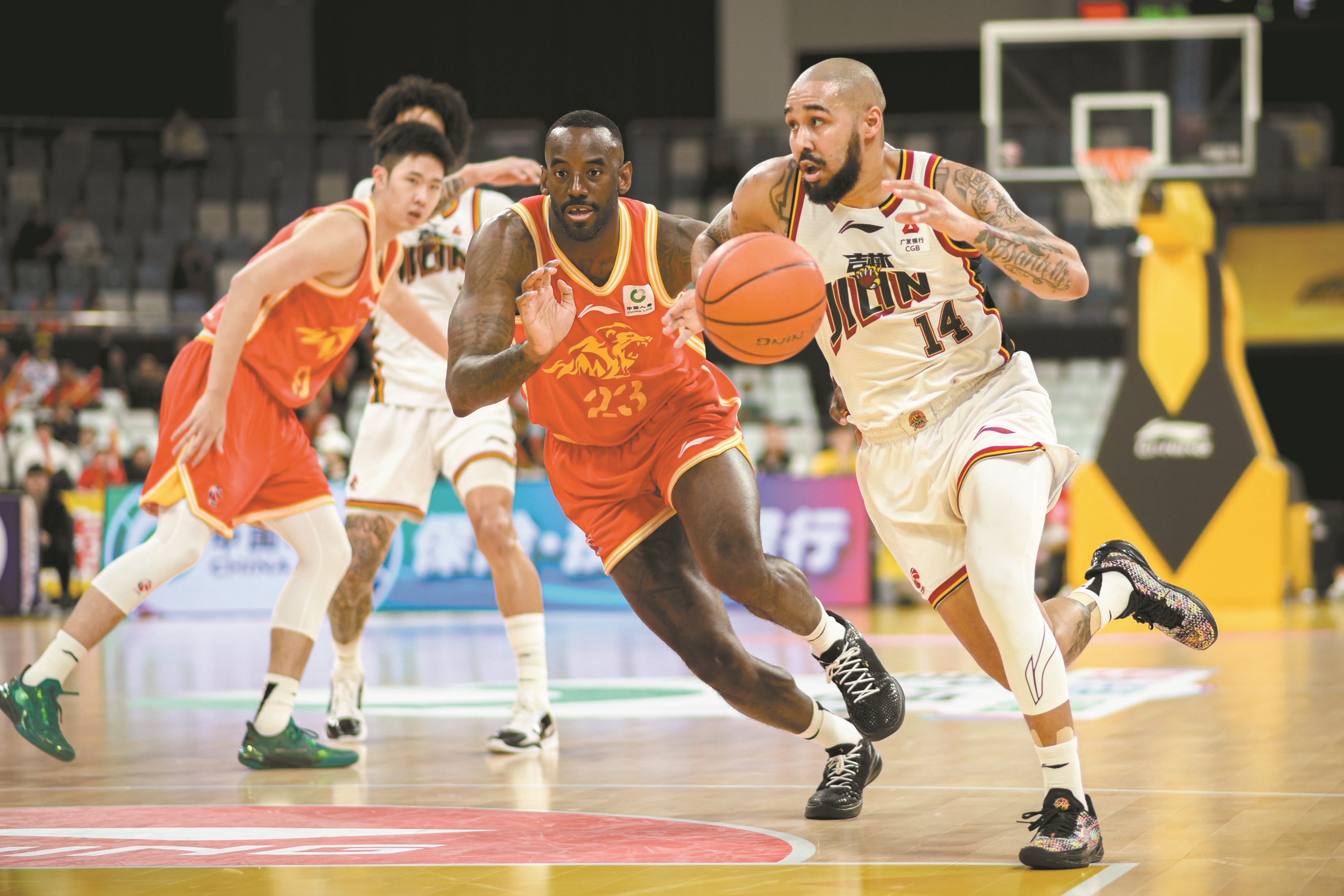 图为3月18日,吉林长白山恩都里队球员摩尔(右一)在比赛中突破。 (新华社发)