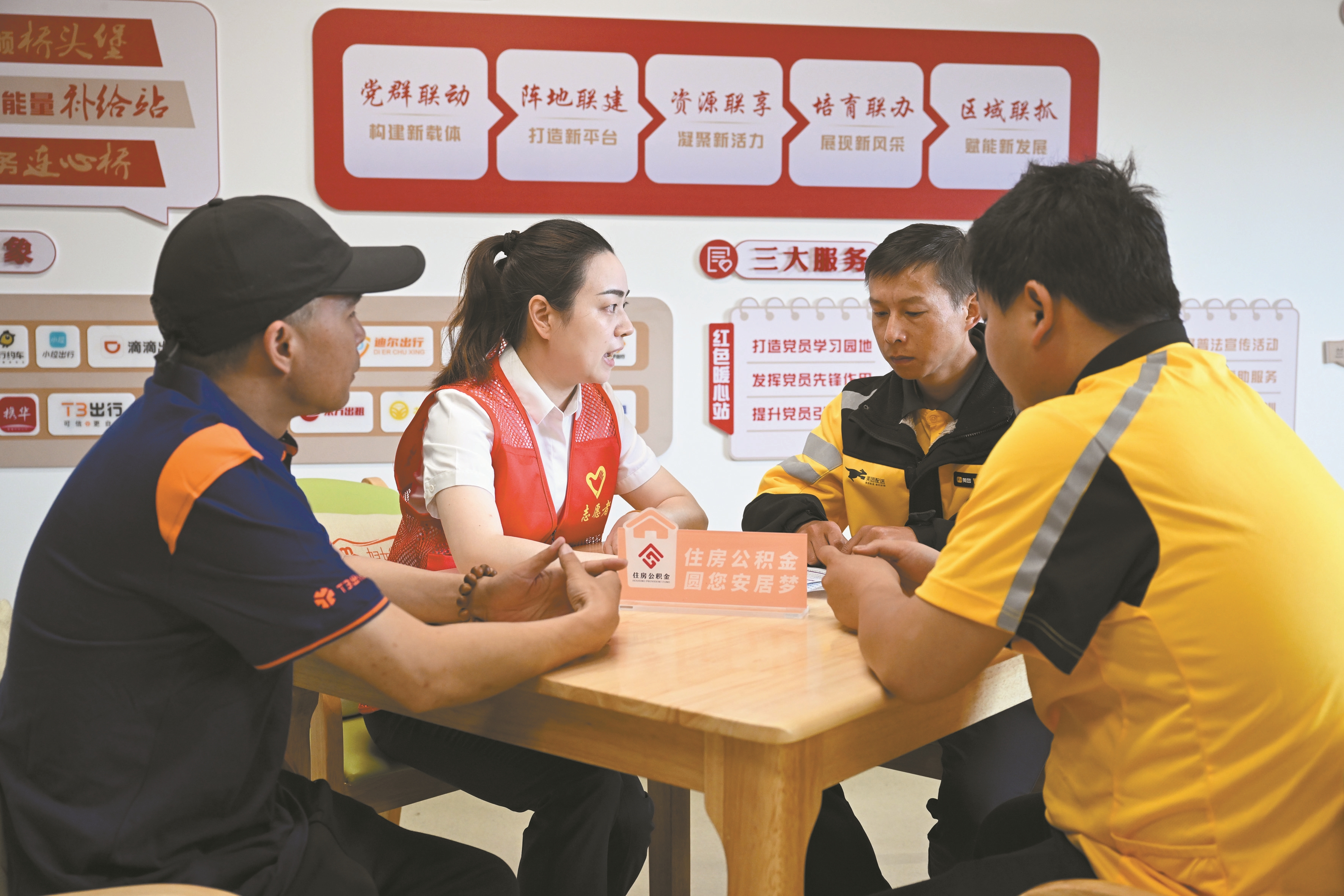 2025年5月9日,在江苏省常州市天宁区红梅街道红动力新能源汽车服务舱,常州市住房公积金管理中心工作人员为外卖骑手、网约车司机提供开户咨询。 新华社记者 季春鹏摄