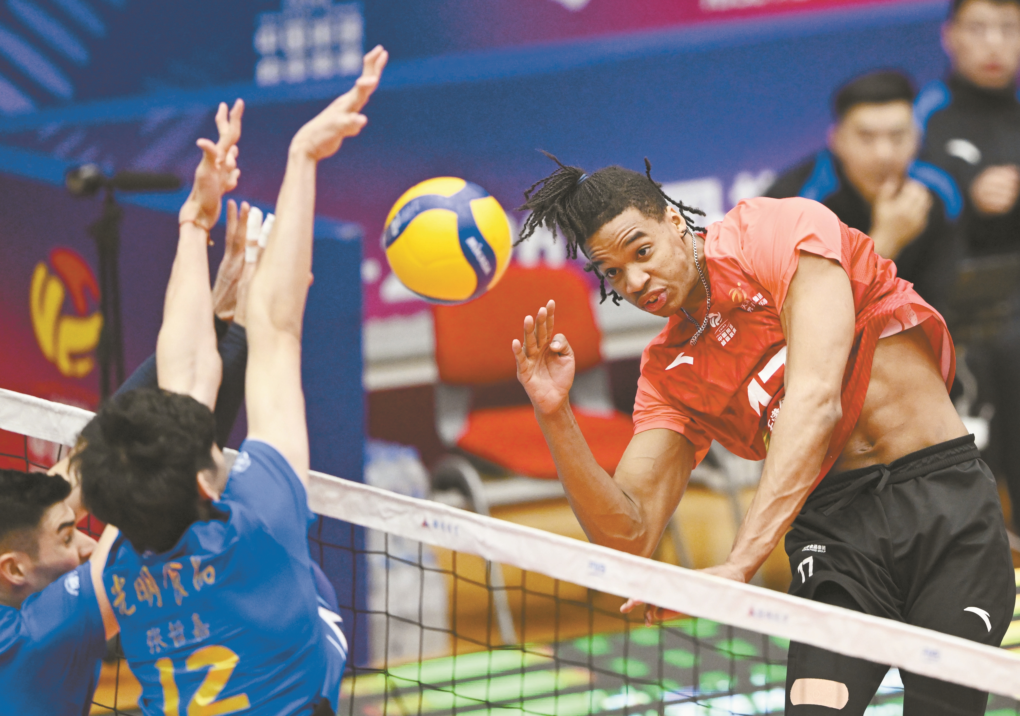 这是当日,天津食品集团队球员阿里汉德罗(右)在比赛中扣球。