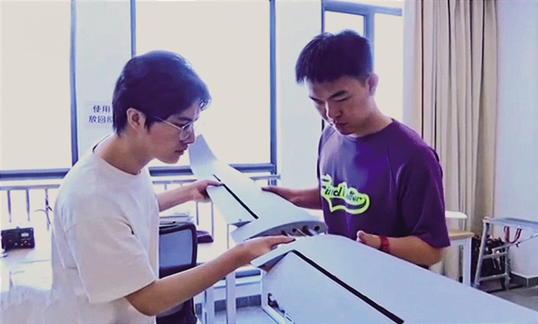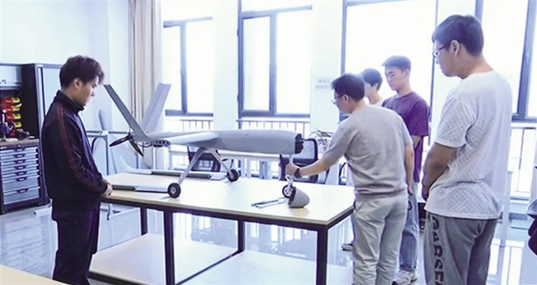 在内蒙古工业大学科创中心智能装备研究院,导师正在为学生讲解固定翼无人机的总体布局及起落架结构设计的内容。该机型是研究院自主研发设计、生产制造的第一架轻型侦察巡检机,除具备较长续航时间外,还可进行区域数据采集、交通引导以及复杂地形的快速侦察。