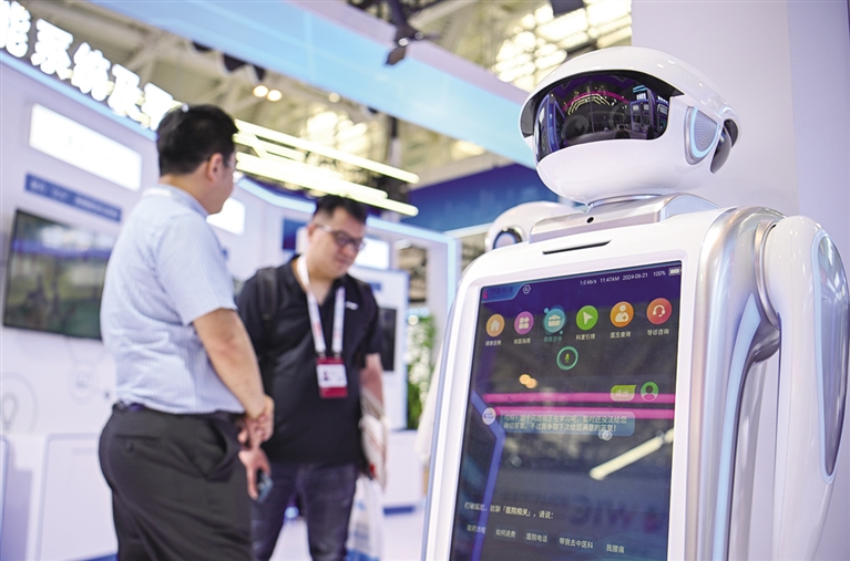 6月21日,博览会现场一款适用于医疗场景的导诊机器人。 ■新华社记者 孙凡越 摄