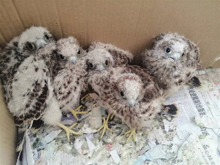 “这5只小红隼刚出生没几天,是托县供电局工作人员在巡查线路时发现的,当时鸟妈妈不在,等了好久鸟妈妈也没有回来,工作人员怕小红隼出现意外,就拨打电话报警,托县林草局野生动物救护中心工作人员把小红隼带回来送到我们这里。”记者看到,在一个纸箱子里,5只毛茸茸的小红隼张着黄黄的嘴巴等喂食,工作人员李建文拿出面包虫,用小夹子夹上虫子一只只挨个喂。李建文说,这几只小红隼送过来一周了,每天有专人按时喂养它们。再过一段时间长大了就放到大笼子里,慢慢训练有了野外生存能力后再把它们放归大自然。