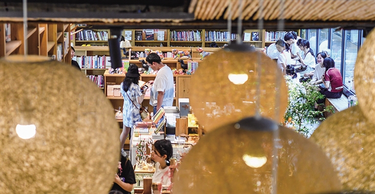 7月15日,游客在重庆市江北区北仓文创街区休闲、选购文创商品。