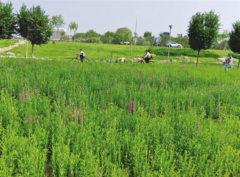 漫步在大黑河郊野公园的云溪花影景观节点,总能见到三三两两的园林工人忙碌的身影,有的侍弄花朵,有的操作机器修剪草坪。这个园中园是市本级园林部门今年新建的园林景观,在原有绿地基础上,以海绵城市生态建设理念为指导,营建生态旱溪、雨水花园、多年生宿根花海、生态小径等兼具生态功能与观赏价值的特色景观区域。在花材上,选取园林系统自己培育的观赏价值较高的花卉、观赏草,采用成片播撒与局部组团栽植相结合方式,营造出花影疏离、野径流芳的效果,为广大市民和游客又提供了一处游憩好去处。