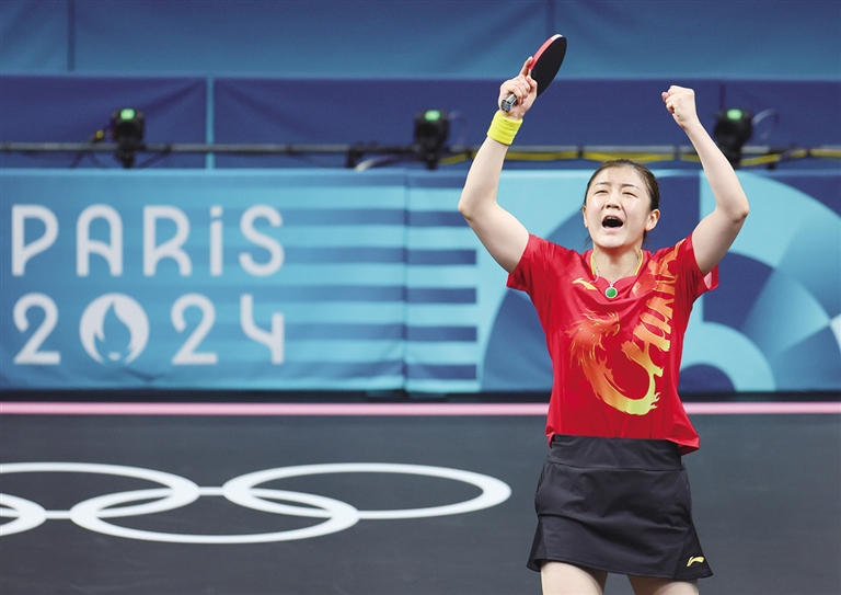 当日,在巴黎奥运会乒乓球女子单打决赛中,中国选手陈梦4比2战胜队友孙颖莎,夺得冠军。