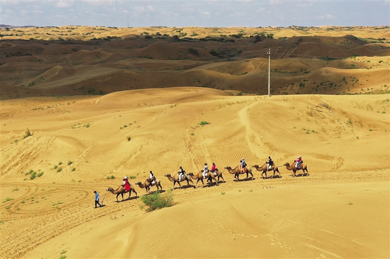 随着沙漠旅游越来越红火,银肯塔拉景区带动展旦召嘎查和附近村的村民参与到旅游产业中来,共享沙漠生态变好带来的红利。