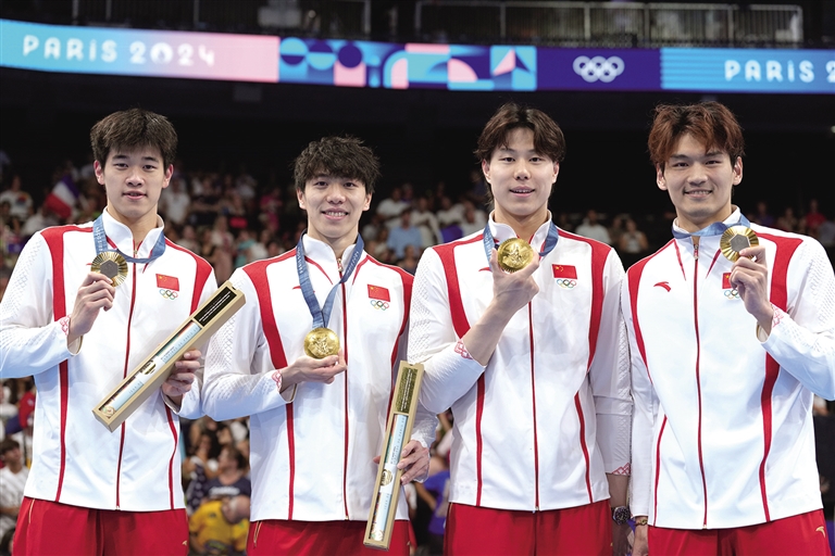 当日,在巴黎奥运会游泳项目男子4×100米混合泳接力决赛中,中国队以3分27秒46的成绩夺得金牌。