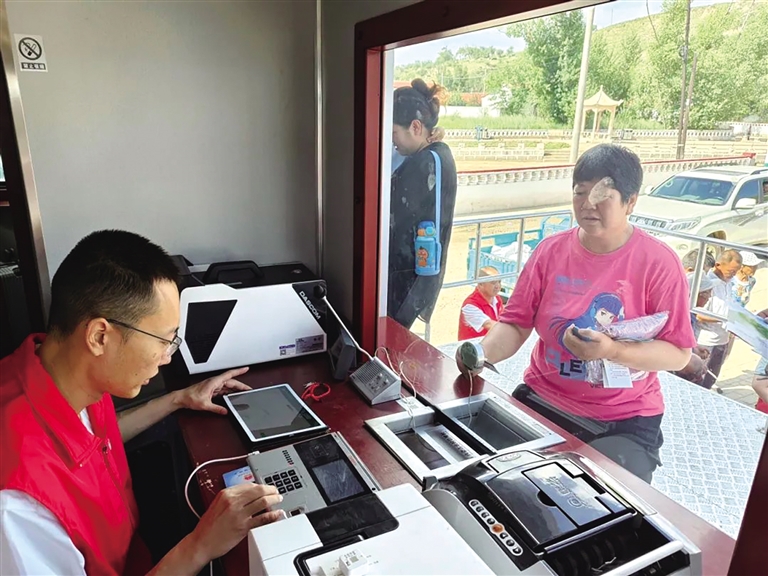 “我的社保卡到期了,能不能在这儿换?”流动银行车刚刚停到巧什营乡忽通兔村委会,一位大娘立刻上前询问。“可以换,大娘,您带身份证和社保卡了吗?”工作人员马上接待了这位大娘,核查信息后,工作人员现场为她制卡,不到10分钟,大娘就拿到了新的社保卡。