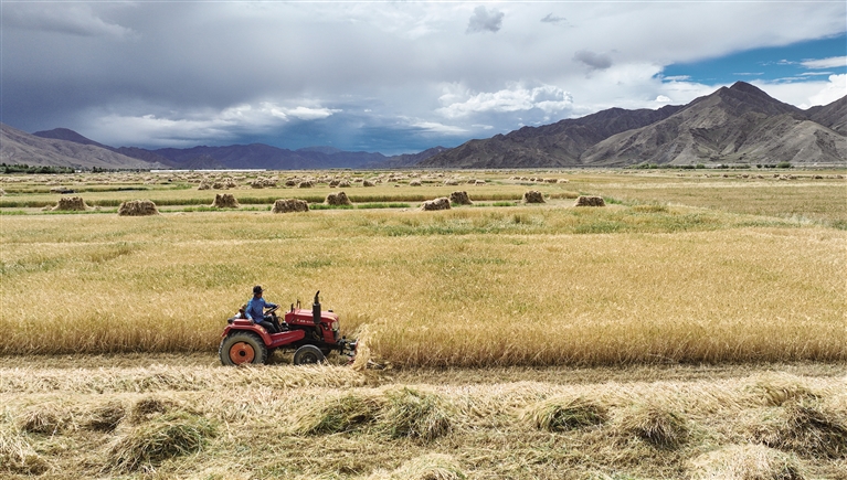 收获季节,享有“西藏粮仓”美誉的日喀则田野一片金黄。在日喀则市白朗县巴扎乡,农民采用机械化、半机械化收割方式,高效收获成熟的青稞。