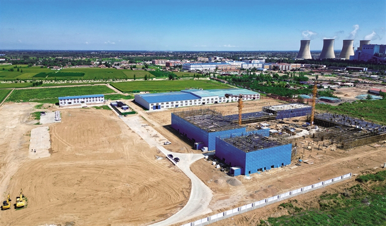 蓝天白云下,工人们正在紧张忙碌,施工现场井然有序,项目建设已完成土建建筑结构主体封顶施工,预计2025年年底试车投运。