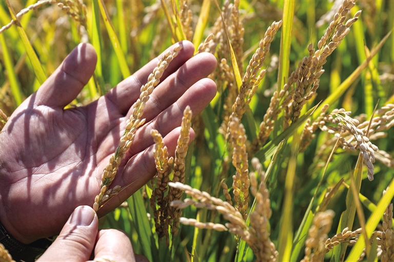 9月24日,在黑龙江省宝清县青原镇,宝清县农业技术推广中心的农艺师在一片稻田中查看水稻长势。