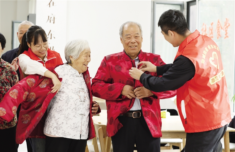 10月10日,山东省临沂市郯城县郯城街道府东社区志愿者为老人试穿新衣。