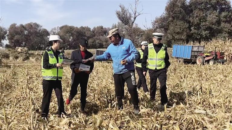 粮食满仓,遍地金黄。交警将交通安全送到田间地头,为秋收增添一抹“公安蓝”,持续用温暖陪伴,在金色田野中守护群众丰收的喜悦。图为交警向村民分发交通安全宣传资料。 ■本报通讯员 王际涵 摄
