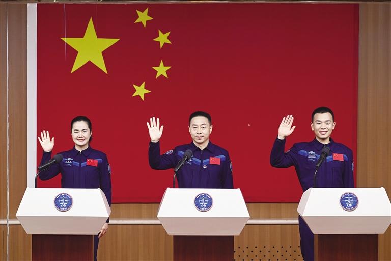 10月29日,神舟十九号载人飞行任务航天员蔡旭哲(中)、宋令东(右)、王浩泽在酒泉卫星发射中心问天阁与媒体记者集体见面。