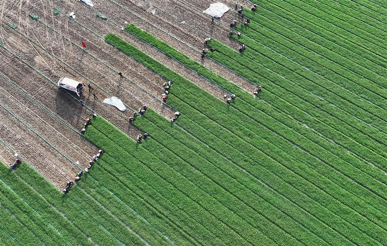 10月29日,河北省唐山市丰南区小集镇一家蔬菜种植合作社的社员在田间收获订单香菜(无人机照片)。