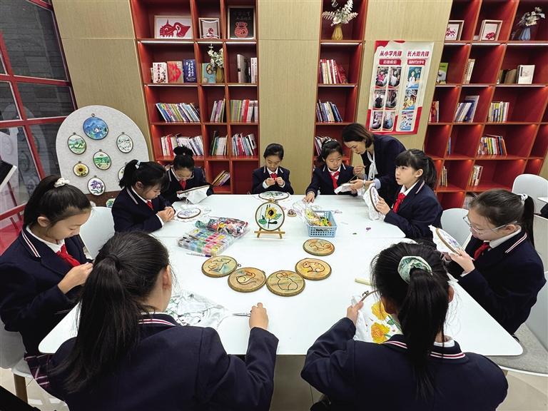 走进校园,记者看到学校社团活动开展得热火朝天。体育馆内,学生们身穿击剑服、手持长剑傲然而立,化身英姿飒爽的击剑运动员;教室里,在老师的指导下,学生们专注地一针一线绣出牡丹图案……