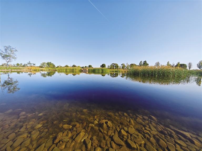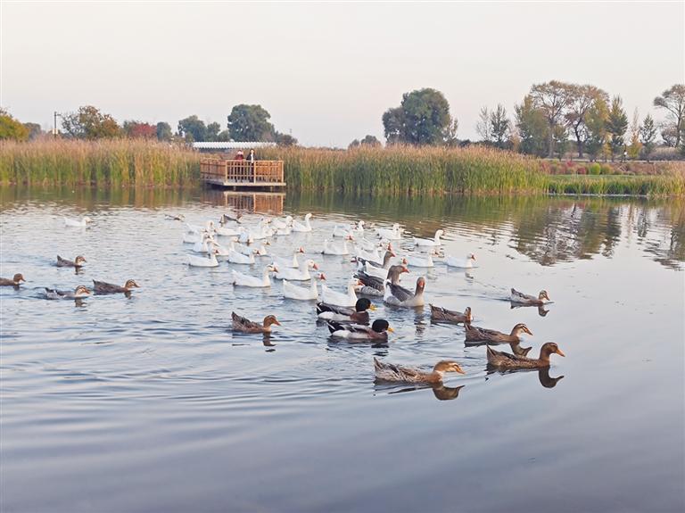 沿丝绸之路大道一路向南,不到半个小时车程,便到达大黑河畔。深秋时节,沿河畔观光随处可见碧波荡漾、水鸟翱翔的景象。茂密的芦苇、游弋的水鸟和一望无际的水面向过往的人们呈现出一幅美丽的生态画卷。