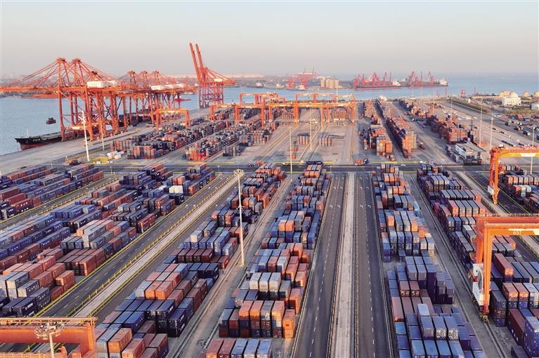11月5日拍摄的唐山港京唐港区集装箱码头堆场(无人机照片)。