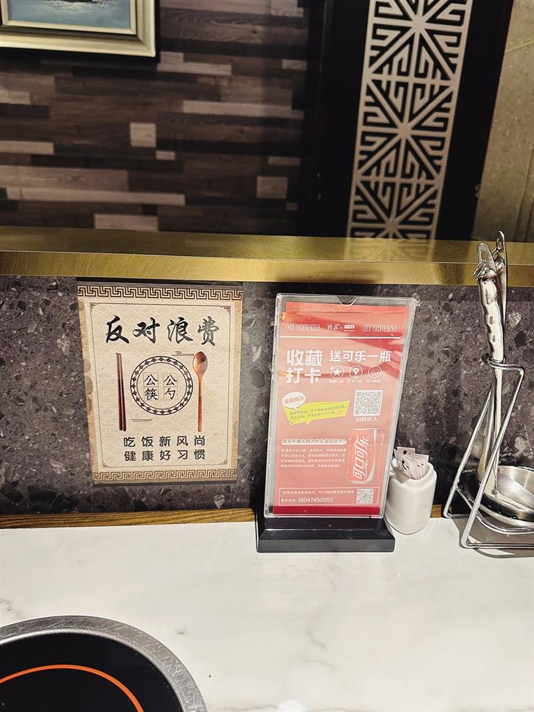 在艺术厅南街的一家火锅店,顾客进店第一眼就能看到醒目张贴的反食品浪费宣传海报。进入点餐环节前,顾客也能在点餐区和餐桌上清楚地看到类似的提示语,如“谁知盘中餐,粒粒皆辛苦,请适量点餐,拒绝浪费”。这些温馨提示无一不在提醒顾客合理点餐,避免浪费。点餐时,工作人员也会及时提示“吃多少,点多少”“剩余菜品请打包”等,以更加细化的服务提醒顾客在用餐中和用餐后落实勤俭节约。