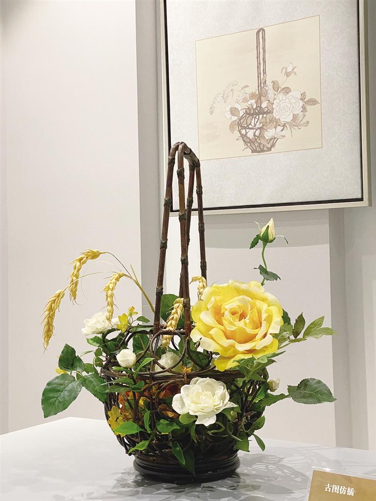“插花作品的创作,要根据不同的场景、环境来构图,包括花器、花材、颜色等选择,要有寓意、凸显意境美、整体美。我们常说一花一叶一器皿,其实是在通过传统插花作品,表达对自然、对生活的眷恋。”廖容琦一边展示她的插花作品,一边介绍:“中国传统插花已有几千年历史,植物的枝、叶、花、果、根都可以作为花材,插花时还要选用适合作品主题的容器,有瓶、盘、缸、碗、篮、筒这六大器皿,还会添加一些配件,如灵芝、如意等模型与中国结组合于作品中,从而达到点明主题、烘托环境的效果。”