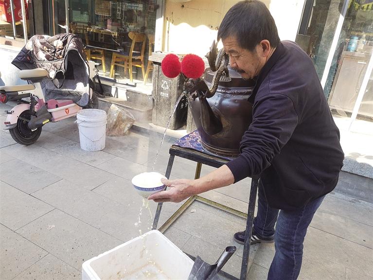 寒冬时节,漫步于清真大寺北巷,一把手工打造的大铜壶格外引人注意,铜壶中就是制作茶汤所用的开水。顾客点单后,陈世忠先将小米面舀到碗里,加入温水化开,随后从铜壶里倒出100摄氏度的热水进行冲碗,这时便可以看到“翻碗不倒”的神奇一幕。在冲好的茶汤上面再铺一层红糖、花生仁等配料后,茶汤就制作完成了。