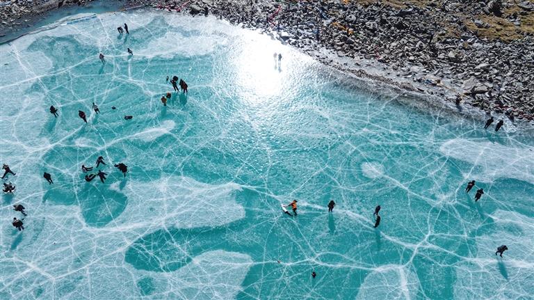 12月7日,游客在琼穆岗嘎峰前的冰湖上游玩(无人机照片)。
