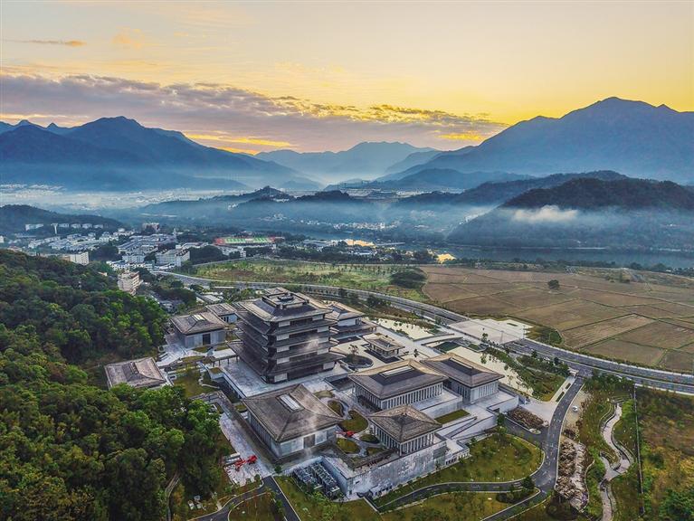 沐浴在晨曦中的广州国家版本馆(2024年12月3日摄,无人机照片)。