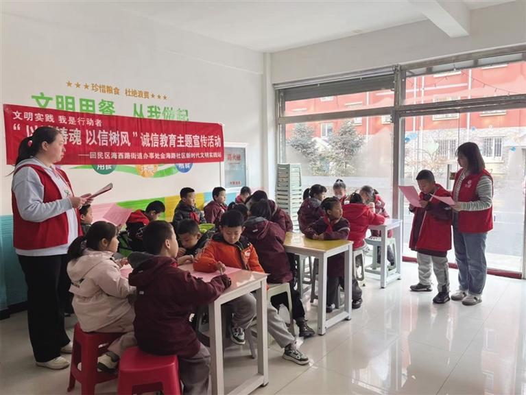 近日,海西路街道金海路社区新时代文明实践站组织开展“以诚铸魂 以信树风”诚信教育主题宣传活动,进一步加强未成年人社会主义核心价值观教育,把诚信教育融入未成年人思想道德建设实践活动中。