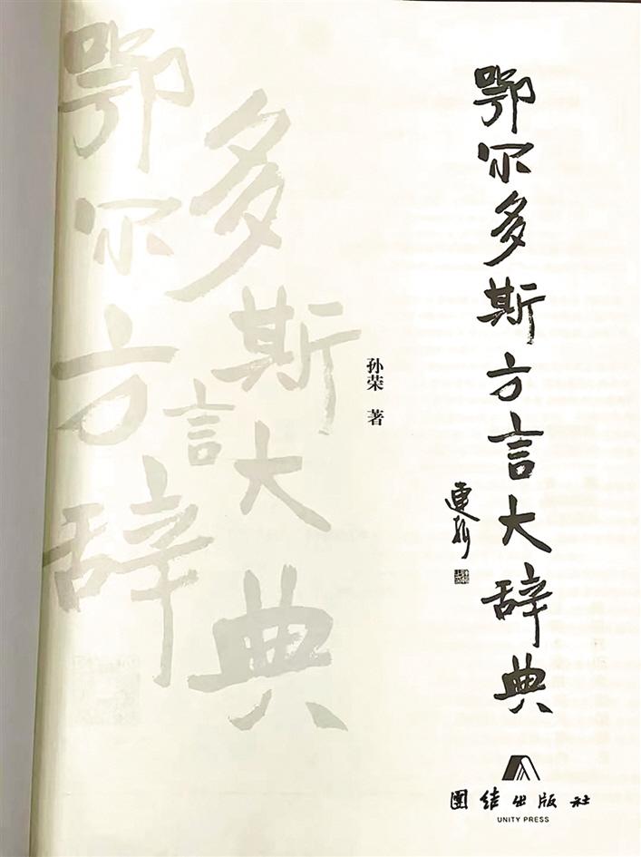 潜心研究鄂尔多斯方言的孙荣,历数年著就《鄂尔多斯方言大辞典》,全书385万字,分为上、下两册。上册是鄂尔多斯方言词汇,共收录词条58439条,共350万字;下册是鄂尔多斯方言俗语,其中包括鄂尔多斯谚语15636条、鄂尔多斯歇后语5241条、鄂尔多斯串话1626条,以及民间(四大)串话152条,共35万字。
