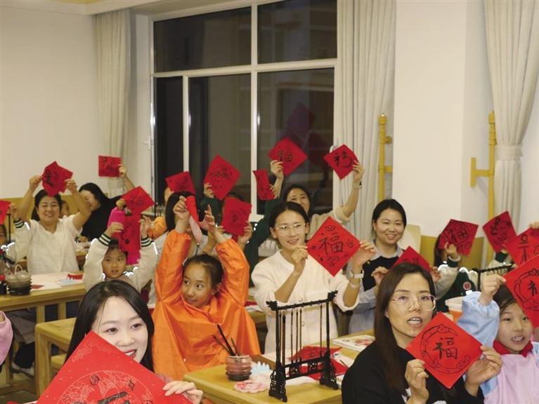“年味是什么颜色?”“年味的颜色是红色的!”从教室到操场,都贴满了喜庆的红色春联、福字,挂上了红红的灯笼,校园里处处洋溢着浓浓的新年气息,家长与孩子们共同书写新年祝福,绘制美好愿景,活动现场欢声笑语不断。