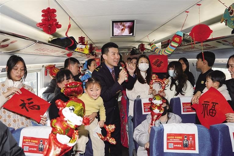 1月13日,在C3685次列车上,旅客与乘务人员互动。