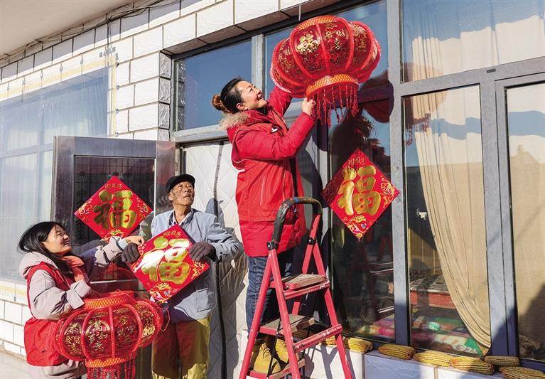 近日,玉泉区2025年文化科技卫生“三下乡”暨文明实践志愿服务集中示范活动在前毛道村举办,活动围绕乡村振兴、理论宣讲、医疗保健、移风易俗、年俗体验、科普宣传等内容,为村民提供多元化服务,把温暖送到群众心坎上。图为志愿者入户为抗美援朝老兵家挂红灯笼、贴福字。