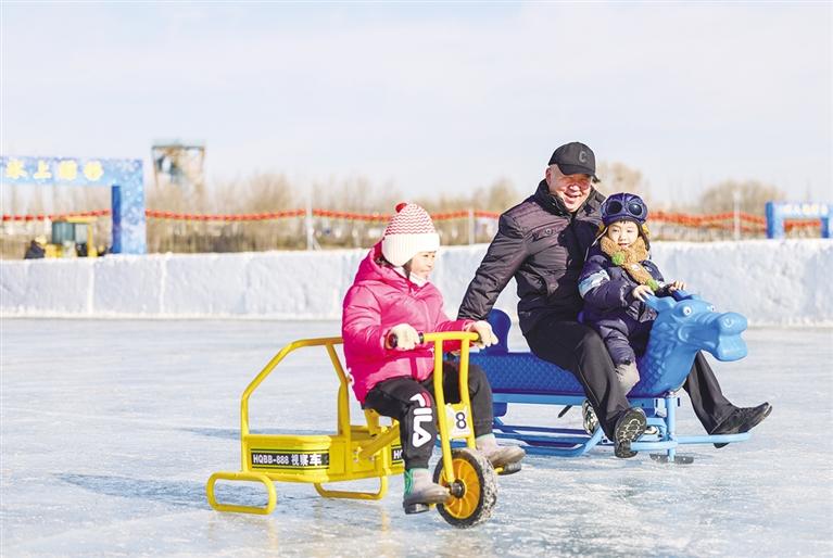 新春佳节来临之际,市民、游客在大黑河军事文化公园花海之约体验冰雪乐趣。