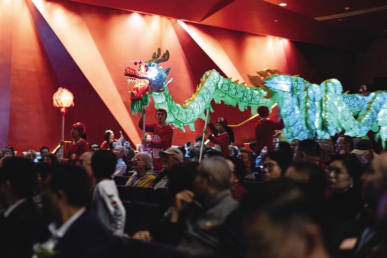 1月26日,演员在美国休斯敦“拥抱春天”春节联欢晚会现场舞龙。