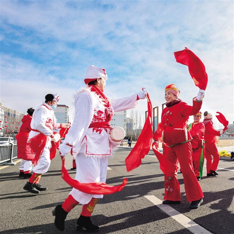 本次活动是2025年呼和浩特新春文化庙会系列活动之一,活动将传统年节的韵味与现代时尚元素相融合,激发出青城独有的文化魅力。活动现场,民间艺人扮演的“财神”走在巡游队伍前列,古装扮相的“铁拐李”“汉钟离”等“八仙”紧随其后,向围观的群众热情互动,送上新年祝福,为市民游客带来一场精彩的民俗文化盛宴。图为活动现场的腰鼓表演。