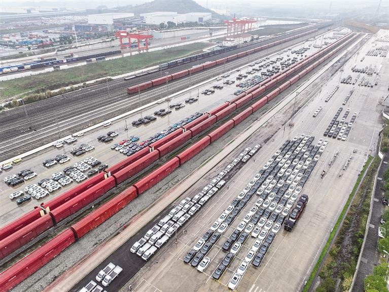 当日,一列装载281辆“重庆造”汽车的JSQ型车(汽车整车运输专用车辆)从重庆鱼嘴站驶出。重庆铁路物流中心数据显示,8天春节假期,重庆铁路累计发出“渝车”5743台,其中出口整车1807台。据介绍,春节期间每天都有运载着“重庆造”整车的班列从鱼嘴站出发,借助西部陆海新通道和中欧班列前往东南亚和欧洲市场。