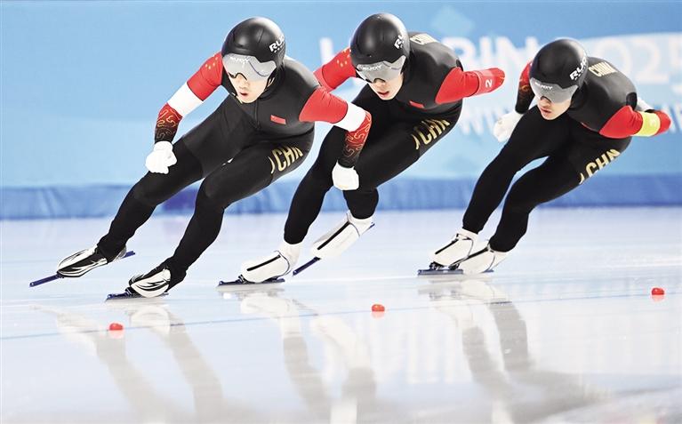 黑龙江省冰上训练中心速滑馆里,《义勇军进行曲》三度奏响。当日速度滑冰全部3枚金牌均被中国队收入囊中。高亭宇先以0.02秒的微弱优势力压日本选手森重航,夺得男子500米冠军;又与队友廉子文、宁忠岩合作,夺得男子短距离团体追逐金牌。女队则又一次让三面五星红旗同时升起,杨滨瑜、韩梅、太智恩分获女子3000米前三名。本届亚冬会有三金入账的高亭宇坦言不知道这会不会是自己最后一届亚冬会,“(这次)我的关键词是努力,相信大家一起努力,中国速度滑冰会越来越好”。