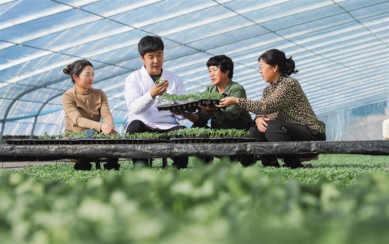 眼下正值春耕备耕时节,日前,内蒙古自治区农牧业科学院蔬菜花卉研究所科研人员走进田间地头,指导设施农业种植户育苗、种植,推广优质种苗、传授先进种植技术,让更多科技成果“下乡”,提高蔬菜产量和质量,用科技带动种植户增产增收。图为科研人员正在指导种植户育苗。